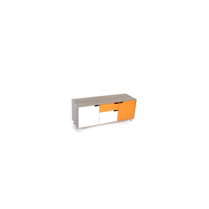 CENTRO DE ENTRETENIMIE LUJO JUVENILFABRICADO EN MDF CON CUBERTA LAMINADA COLOR ROBLE VINTAGE CON 2CAJONES Y 2 PUERTAS BLANCO/NARANJAALTO 50ANCHO 120PROFUNDO 40PAD ABC